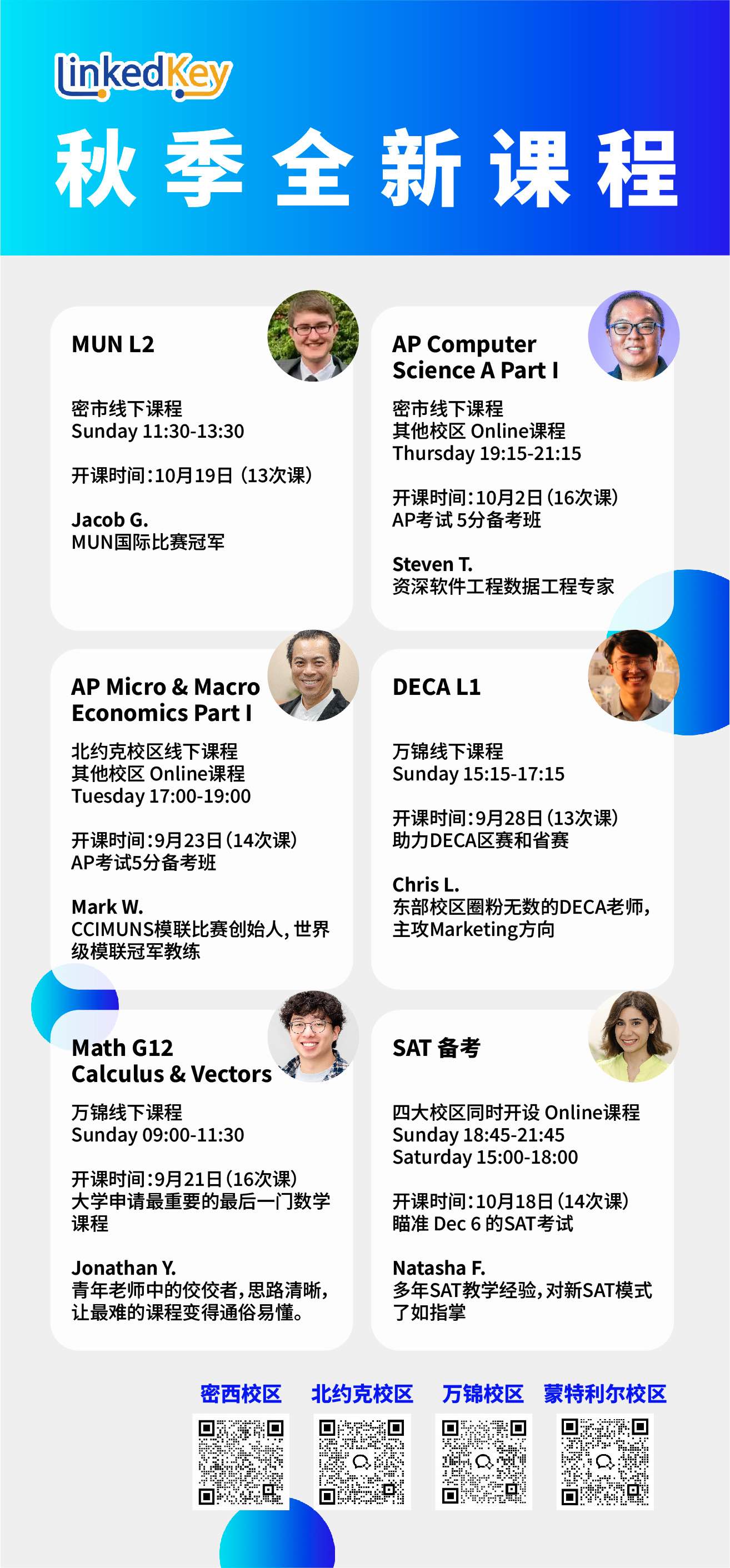 优质的课程怎么能因时间不合适而错过?! 应学生的学习和备考需求,LinkedKey秋季学期新增如下课程。各校区都有选择。帮助学生们提升校内成绩、备战竞赛、冲刺标化考试!