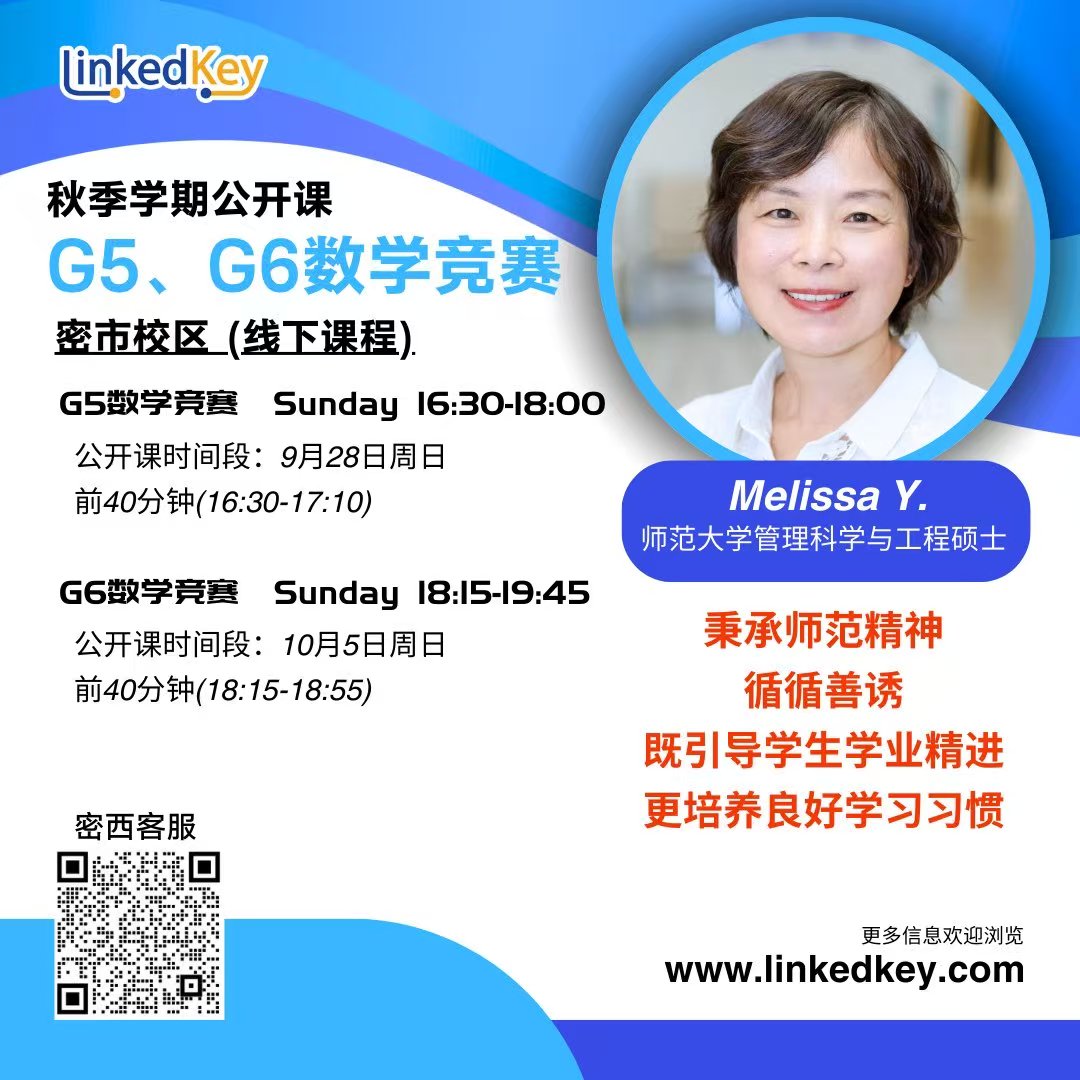 秋季G5、G6数学竞赛课程的Melissa老师,将在9月28日和10月5日的课堂上进行公开课。邀请广大适龄家庭和孩子加入课程。